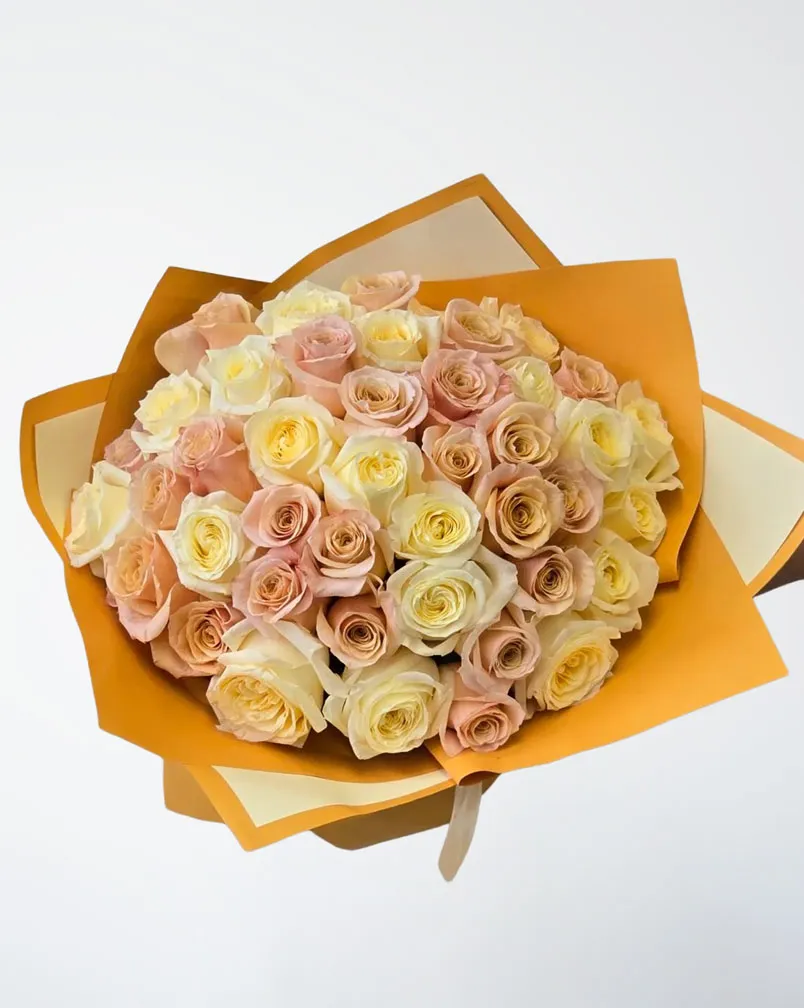 Warm sunlight and soft blush tones come together in this generous gathering of 50 yellow and peach garden roses. Designed to bring comfort, joy, and heartfelt meaning, this arrangement speaks gently without needing many words. Yellow roses share feelings of friendship, optimism, and care, while peach roses carry notes of gratitude, sincerity, and quiet affection. Together, they create a gift that feels thoughtful and sincere for almost any moment.